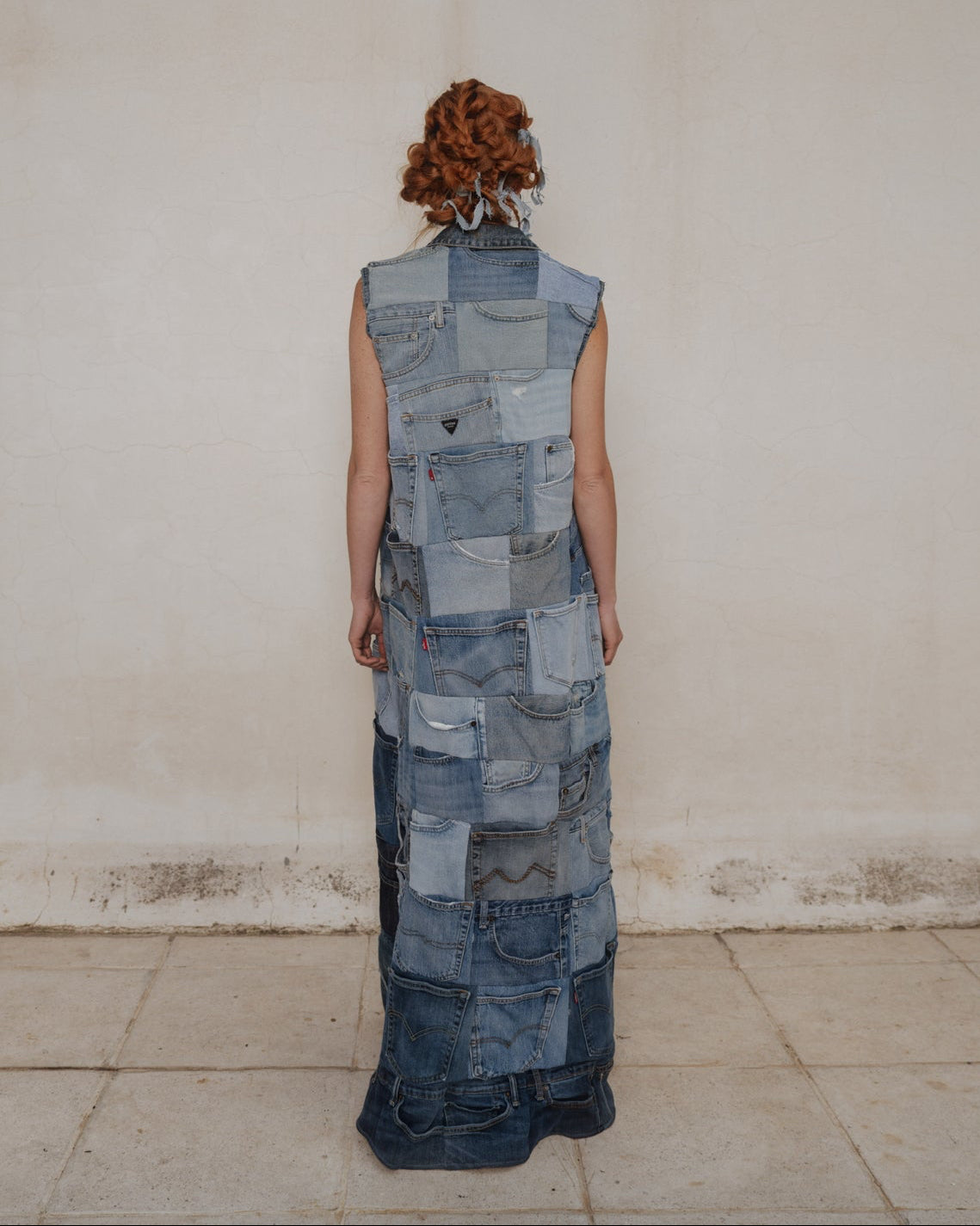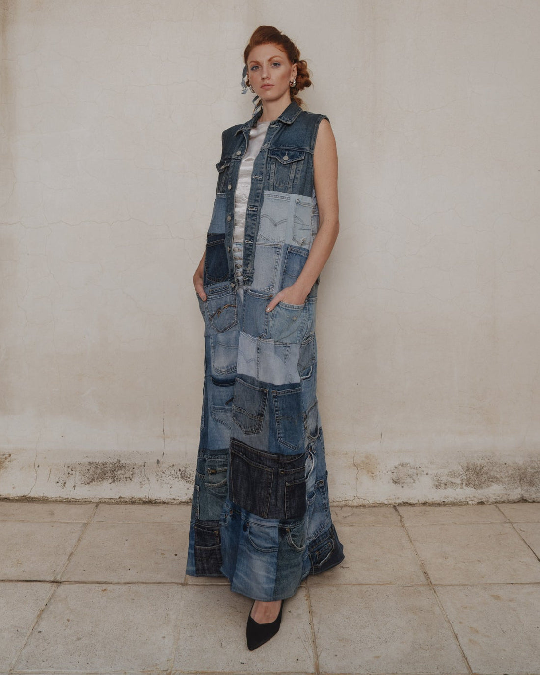 - Experimental designs using upcycled fabrics, paint, embroidery, and hardware